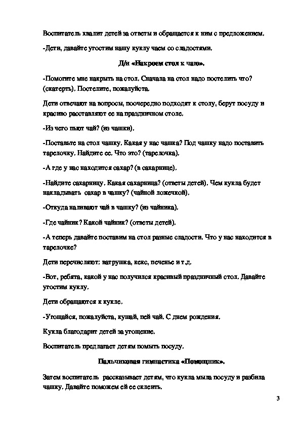 Вопросы к детям, ответы детей, д/и «Накроем стол к чаю», пальчиковая