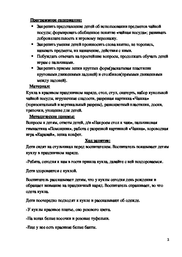 • Закрепить приемы лепки круглых форм(раскатывая пластилин круговыми движениями ладоней) и столбиков(прямыми движениями между ладоней).Итоговое занятие "Кукла в гостях у детей"