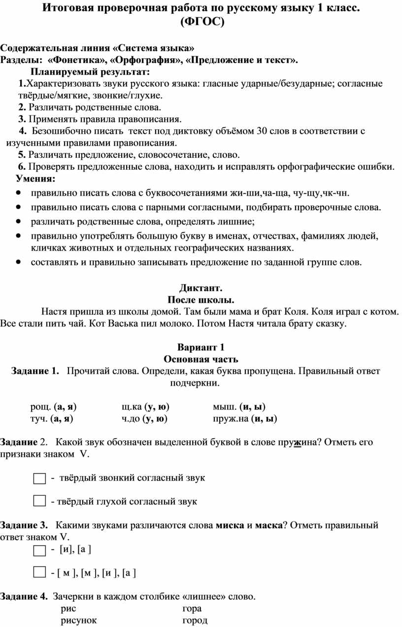 Итоговая проверочная работа по русскому языку 1 класс.