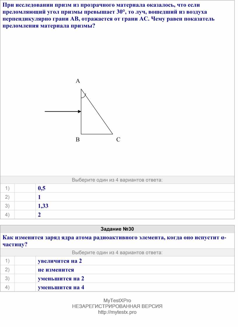 При исследовании призм из прозрачного материала оказалось, что если преломляющий угол призмы превышает 30°, то луч, вошедший из воздуха перпендикулярно грани АВ, отражается от грани АС. Чему равен показатель преломления материала призмы?