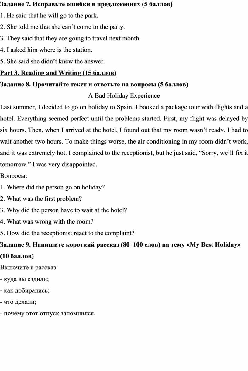 Задание 9. Напишите короткий рассказ (80–100 слов) на тему «My Best Holiday» (10 баллов)