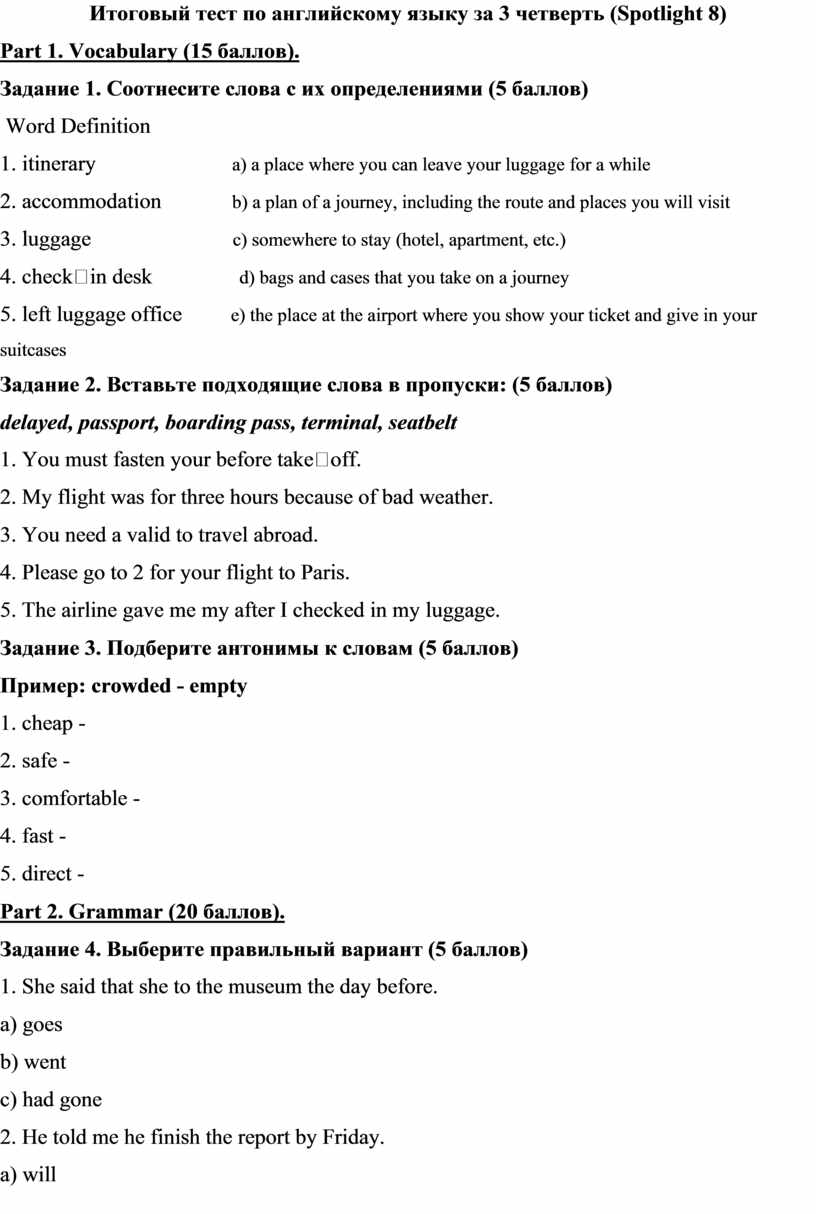 Итоговый тест по английскому языку за 3 четверть (Spotlight 8)