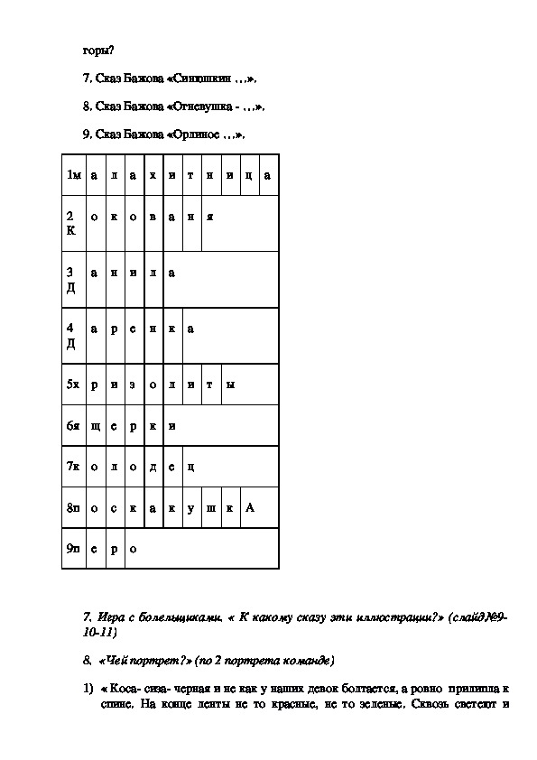 Цель: 1) проверить знание учащимися текстов сказов, героев;