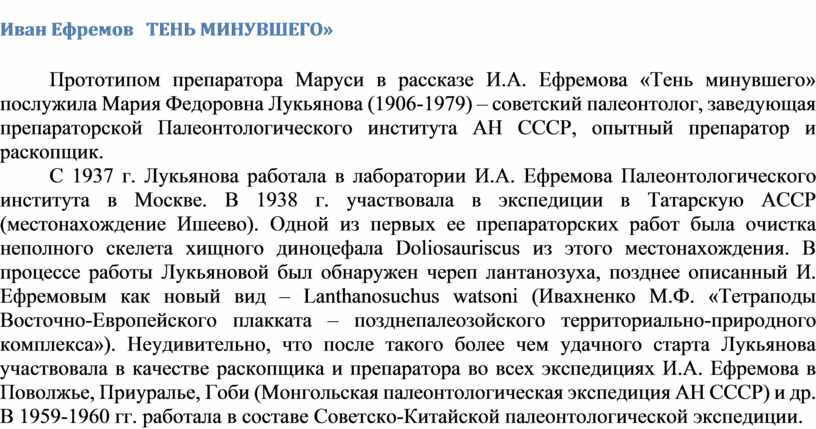 Прототипом препаратора Маруси в рассказе И.А. Ефремова «Тень минувшего» послужила Мария Федоровна Лукьянова (1906-1979) – советский палеонтолог, заведующая препараторской Палеонтологического института АН СССР, опытный препаратор и раскопщик.