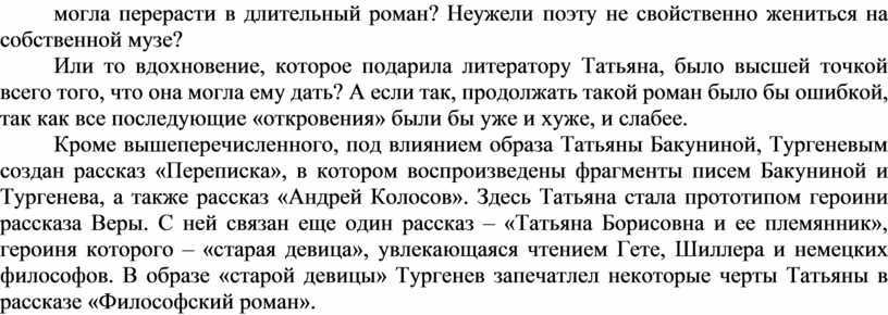 Кроме вышеперечисленного, под влиянием образа Татьяны Бакуниной, Тургеневым создан рассказ «Переписка», в котором воспроизведены фрагменты писем Бакуниной и Тургенева, а также рассказ «Андрей Колосов». Здесь Татьяна стала прототипом героини рассказа Веры. С ней связан еще один рассказ – «Татьяна Борисовна и ее племянник», героиня которого – «старая девица», увлекающаяся чтением Гете, Шиллера и немецких философов. В образе «старой девицы» Тургенев запечатлел некоторые черты Татьяны в рассказе «Философский роман».