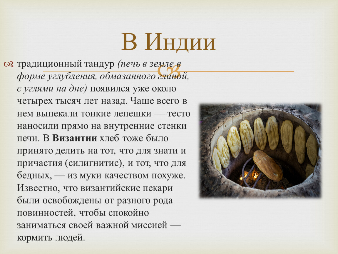 традиционный тандур (печь в земле в форме углубления, обмазанного глиной, с углями на дне) появился уже около четырех тысяч лет назад. Чаще всего в нем выпекали тонкие лепешки — тесто наносили прямо на внутренние стенки печи. В Византии хлеб тоже было принято делить на тот, что для знати и причастия (силигнитис), и тот, что для бедных, — из муки качеством похуже. Известно, что византийские пекари были освобождены от разного рода повинностей, чтобы спокойно заниматься своей важной миссией — кормить людей.