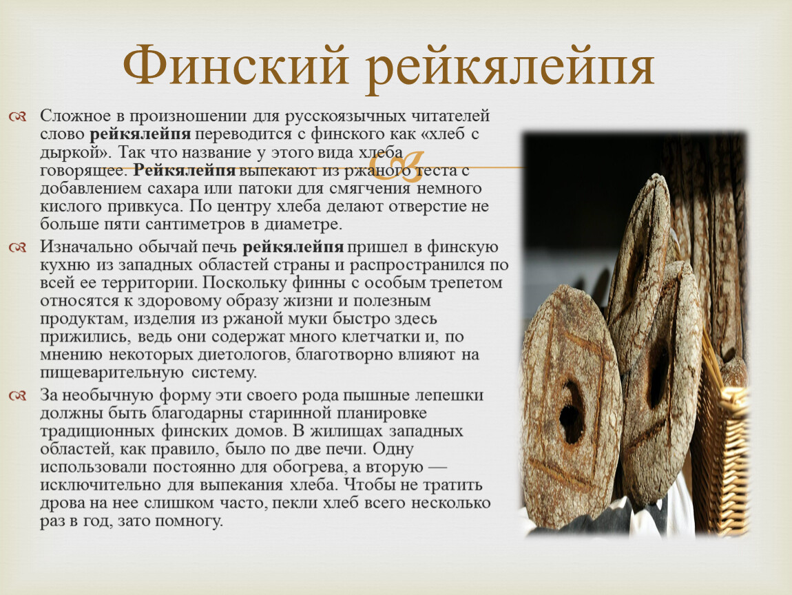Сложное в произношении для русскоязычных читателей слово рейкялейпя переводится с финского как «хлеб с дыркой». Так что название у этого вида хлеба говорящее. Рейкялейпя выпекают из ржаного теста с добавлением сахара или патоки для смягчения немного кислого привкуса. По центру хлеба делают отверстие не больше пяти сантиметров в диаметре.