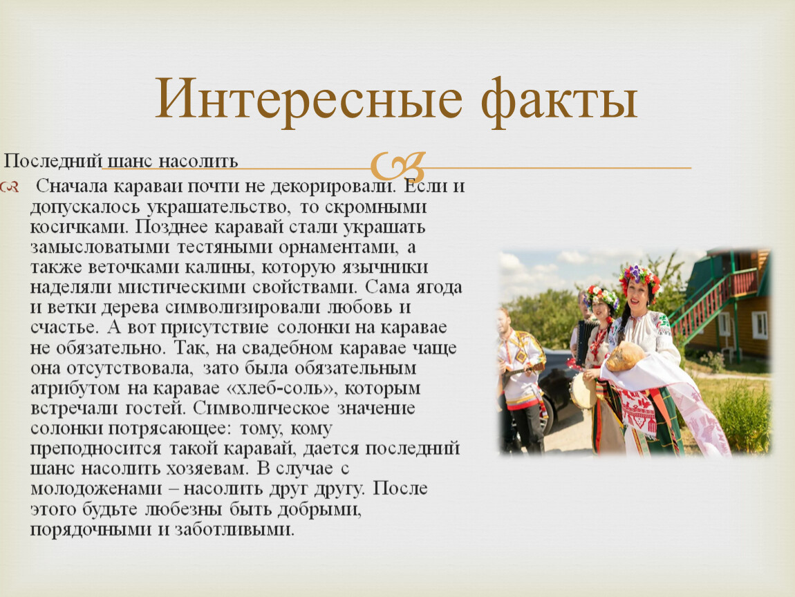 Сначала караваи почти не декорировали. Если и допускалось украшательство, то скромными косичками. Позднее каравай стали украшать замысловатыми тестяными орнаментами, а также веточками калины, которую язычники наделяли мистическими свойствами. Сама ягода и ветки дерева символизировали любовь и счастье. А вот присутствие солонки на каравае не обязательно. Так, на свадебном каравае чаще она отсутствовала, зато была обязательным атрибутом на каравае «хлеб-соль», которым встречали гостей. Символическое значение солонки потрясающее: тому, кому преподносится такой каравай, дается последний шанс насолить хозяевам. В случае с молодоженами – насолить друг другу. После этого будьте любезны быть добрыми, порядочными и заботливыми.