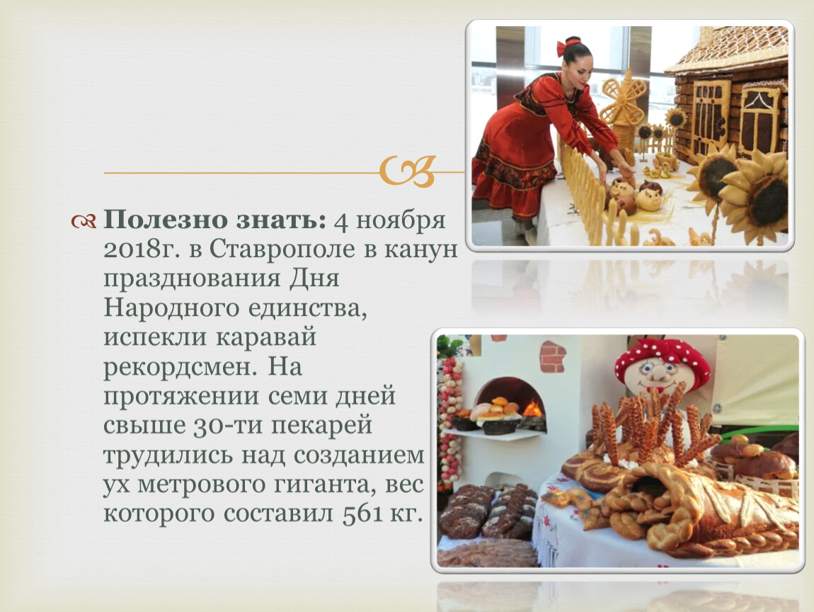 Полезно знать: 4 ноября 2018г. в Ставрополе в канун празднования Дня Народного единства, испекли каравай рекордсмен. На протяжении семи дней свыше 30-ти пекарей трудились над созданием 2-ух метрового гиганта, вес которого составил 561 кг.