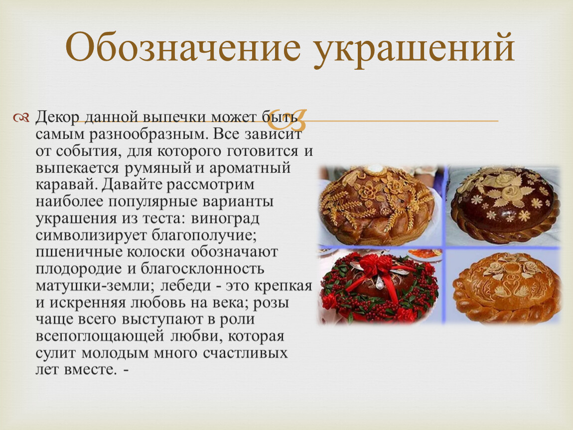 Украшали каравай сложными тестяными узорами. Фигурки двух лебедей - символ верности и преданности, колосья пшеницы - знак процветания и плодородия, веточки калины - образ плодовитости и красоты, гроздья винограда – символ благополучия и достатка для молодой семьи.Подавали каравай всегда на рушнике, красивом расшитом полотенце неотъемлемым атрибутом Славянских традиций. Делить каравай разрешалось только крёстному отцу невесты или жениха. По традиции разламывание каравая означало нарушение девственности молодухи. Молодожены получали свою порцию первыми, а оставшуюся часть делили поровну между приглашенными родственниками молодого и родными молодухи. Вместе с кусочком каравая молодые делились с гостями своим счастьем, гости в ответ благодарили щедрыми подарками.