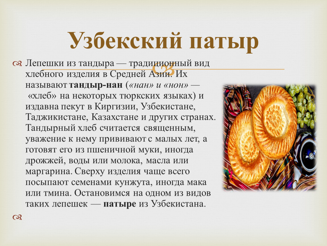 Лепешки из тандыра — традиционный вид хлебного изделия в Средней Азии. Их называют тандыр-нан («нан» и «нон» — «хлеб» на некоторых тюркских языках) и издавна пекут в Киргизии, Узбекистане, Таджикистане, Казахстане и других странах. Тандырный хлеб считается священным, уважение к нему прививают с малых лет, а готовят его из пшеничной муки, иногда дрожжей, воды или молока, масла или маргарина. Сверху изделия чаще всего посыпают семенами кунжута, иногда мака или тмина. Остановимся на одном из видов таких лепешек — патыре из Узбекистана.