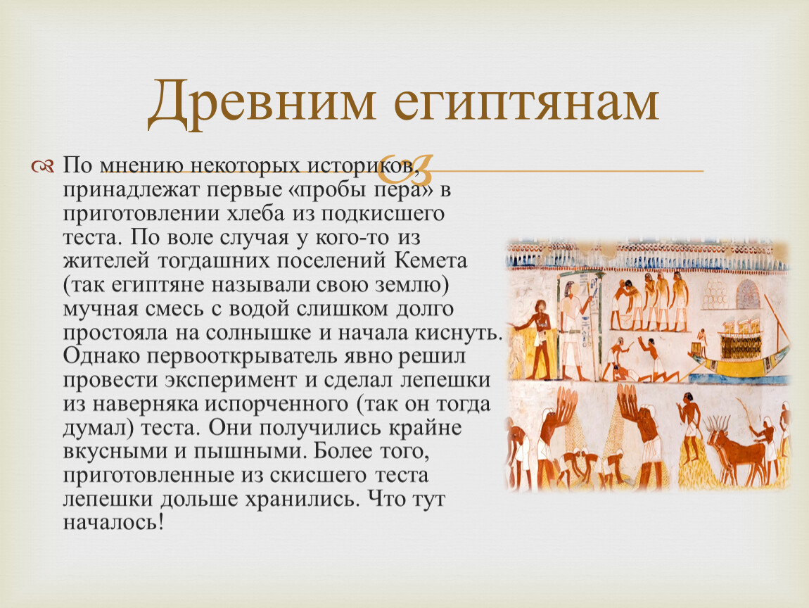 По мнению некоторых историков, принадлежат первые «пробы пера» в приготовлении хлеба из подкисшего теста. По воле случая у кого-то из жителей тогдашних поселений Кемета (так египтяне называли свою землю) мучная смесь с водой слишком долго простояла на солнышке и начала киснуть. Однако первооткрыватель явно решил провести эксперимент и сделал лепешки из наверняка испорченного (так он тогда думал) теста. Они получились крайне вкусными и пышными. Более того, приготовленные из скисшего теста лепешки дольше хранились. Что тут началось!