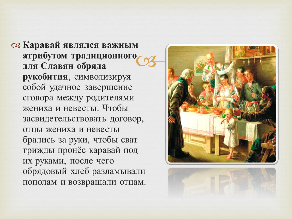 Каравай являлся важным атрибутом традиционного для Славян обряда рукобития, символизируя собой удачное завершение сговора между родителями жениха и невесты. Чтобы засвидетельствовать договор, отцы жениха и невесты брались за руки, чтобы сват трижды пронёс каравай под их руками, после чего обрядовый хлеб разламывали пополам и возвращали отцам.