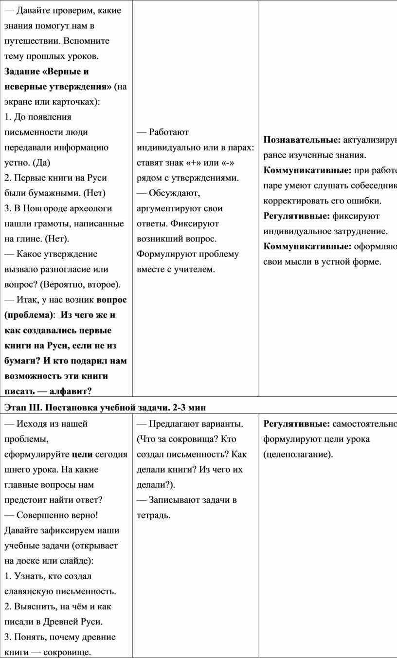 · Проблемные вопросы и целеполагание («Кто создал письменность?», «На чём писали?») — ученики сами формулируют цели, что повышает внутреннюю учебную мотивацию (я хочу найти ответ).
