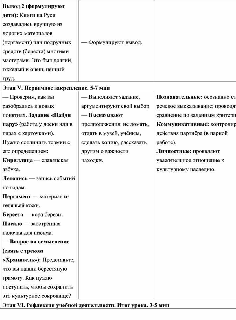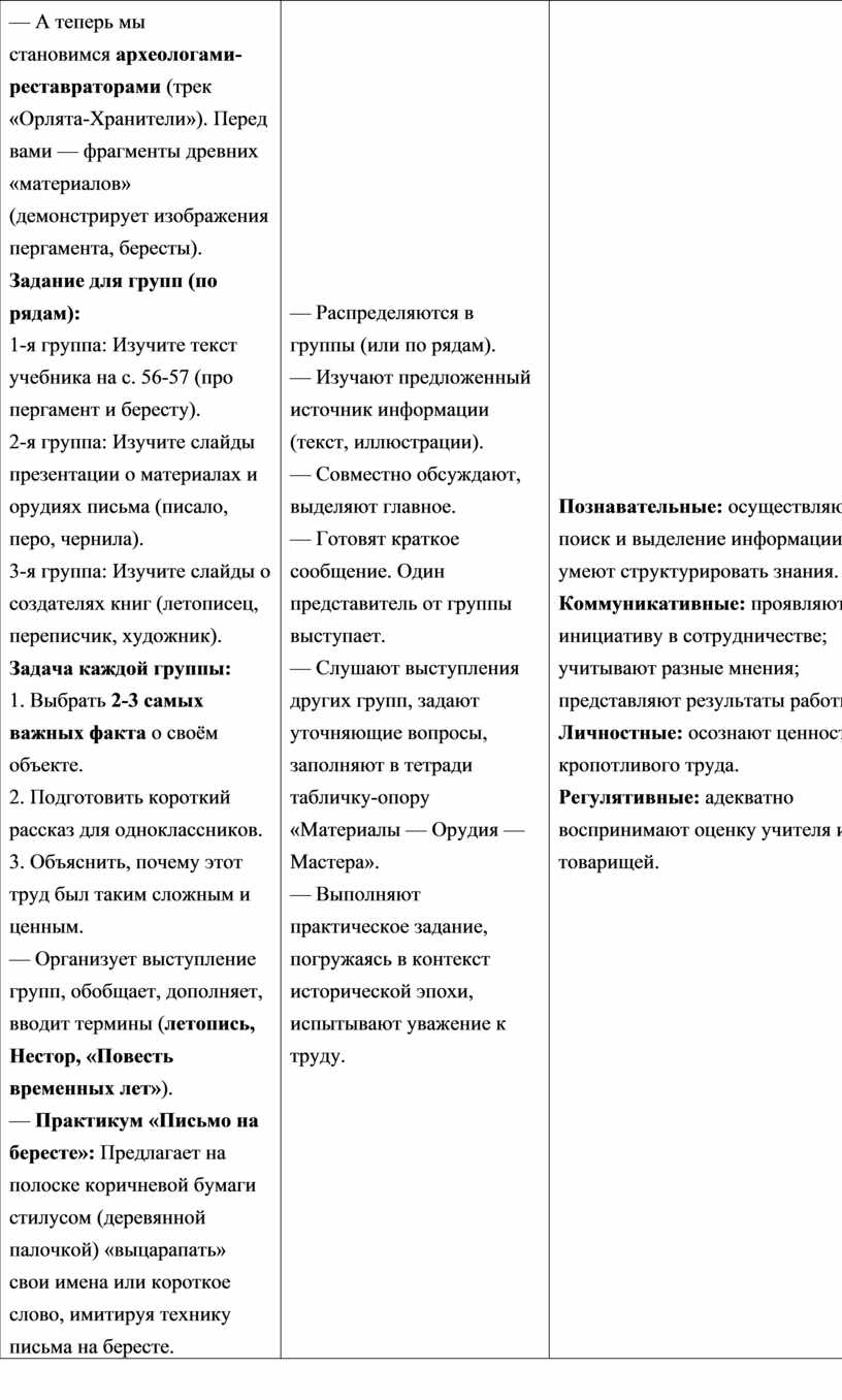 у доски или в парах с карточками). — Вопрос на осмысление (связь с треком «Хранитель»): Представьте, что вы нашли берестяную грамоту. Как нужно поступить, чтобы сохранить это культурное сокровище? |