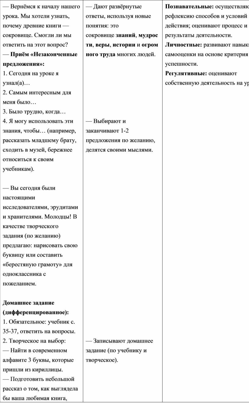 — Вы сегодня были настоящими исследователями, эрудитами и хранителями. Молодцы! В качестве творческого задания (по желанию) предлагаю: нарисовать свою буквицу или составить «берестяную грамоту» для одноклассника с пожеланием.