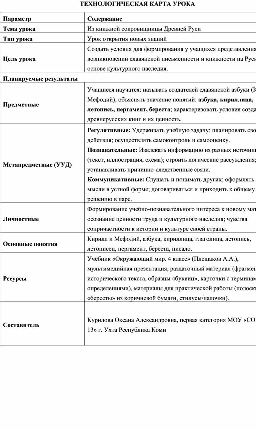 Учебник «Окружающий мир. 4 класс» (Плешаков А.А.), мультимедийная презентация, раздаточный материал (фрагмент исторического текста, образцы «буквиц», карточки с терминами и определениями), материалы для практической работы (полоски «бересты» из коричневой бумаги, стилусы/палочки). |