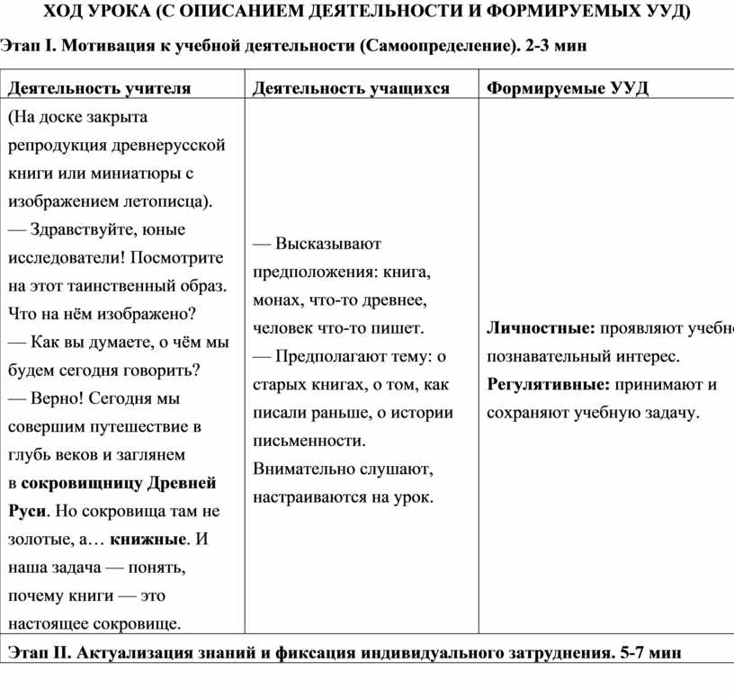ХОД УРОКА (С ОПИСАНИЕМ ДЕЯТЕЛЬНОСТИ И ФОРМИРУЕМЫХ УУД)