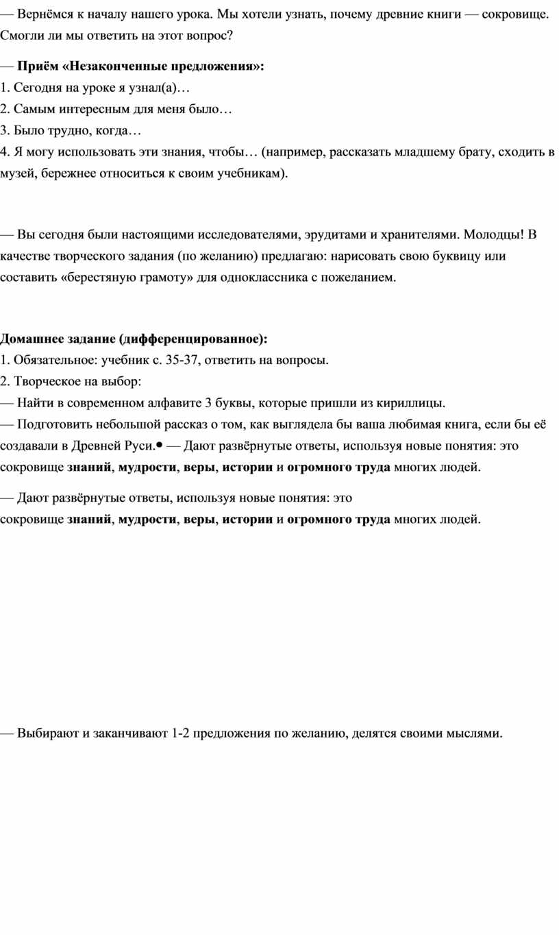 — Вернёмся к началу нашего урока. Мы хотели узнать, почему древние книги — сокровище. Смогли ли мы ответить на этот вопрос? — Приём