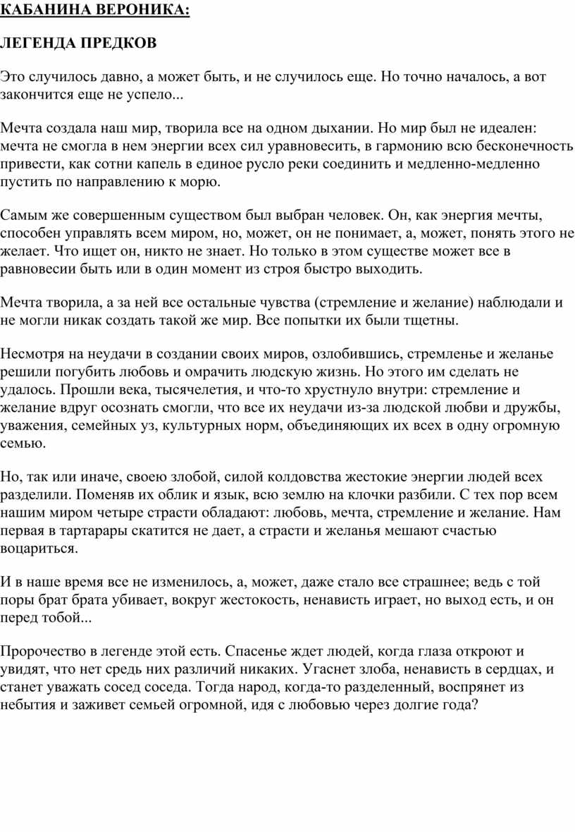 Пророчество в легенде этой есть. Спасенье ждет людей, когда глаза откроют и увидят, что нет средь них различий никаких. Угаснет злоба, ненависть в сердцах, и станет уважать сосед соседа. Тогда народ, когда-то разделенный, воспрянет из небытия и заживет семьей огромной, идя с любовью через долгие года?