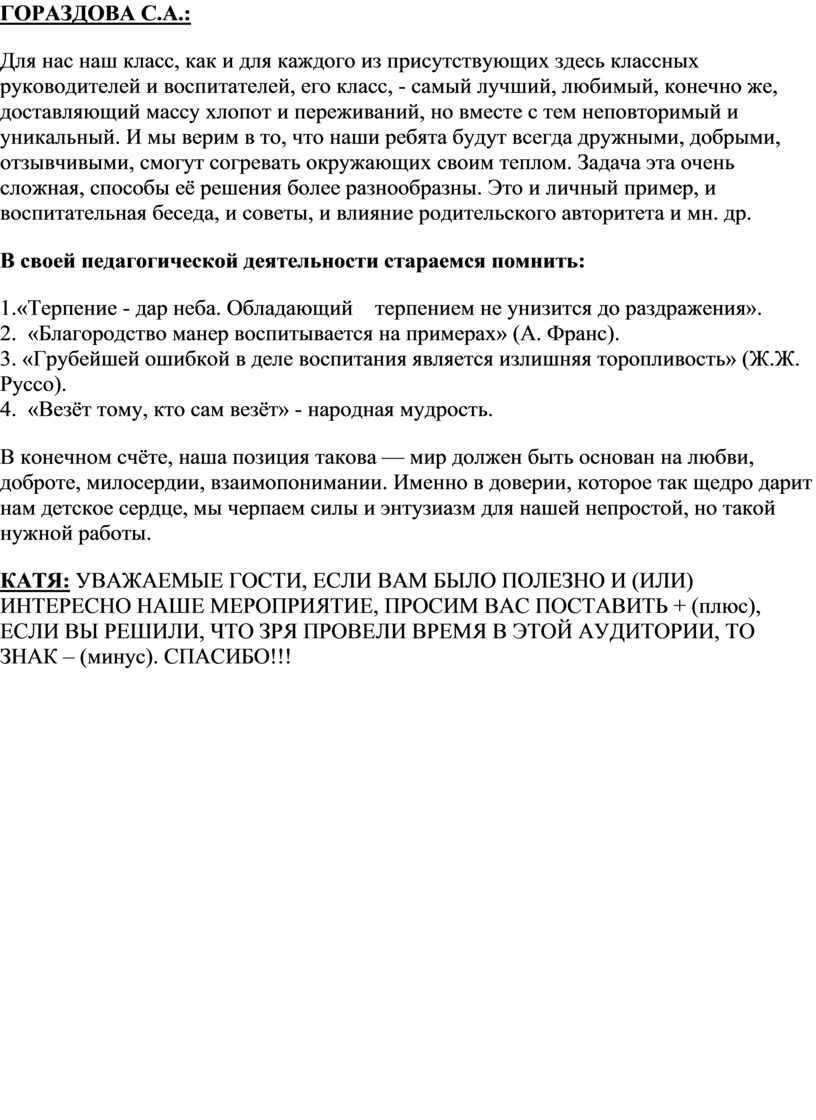 Для нас наш класс, как и для каждого из присутствующих здесь классных руководителей и воспитателей, его класс, - самый лучший, любимый, конечно же, доставляющий массу хлопот и переживаний, но вместе с тем неповторимый и уникальный. И мы верим в то, что наши ребята будут всегда дружными, добрыми, отзывчивыми, смогут согревать окружающих своим теплом. Задача эта очень сложная, способы её решения более разнообразны. Это и личный пример, и воспитательная беседа, и советы, и влияние родительского авторитета и мн. др.