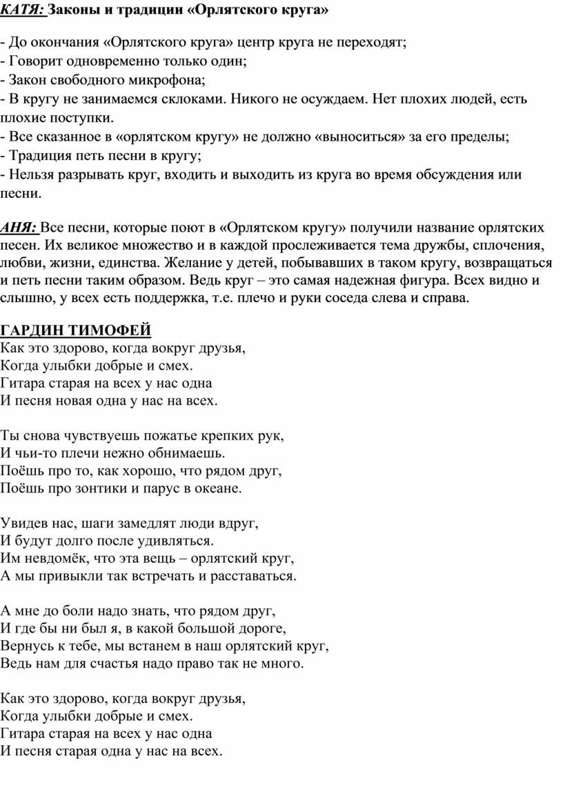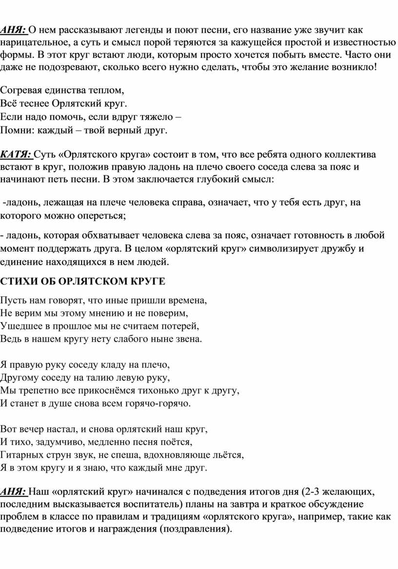 КАТЯ: Суть «Орлятского круга» состоит в том, что все ребята одного коллектива встают в круг, положив правую ладонь на плечо своего соседа слева за пояс и начинают петь песни. В этом заключается глубокий смысл: