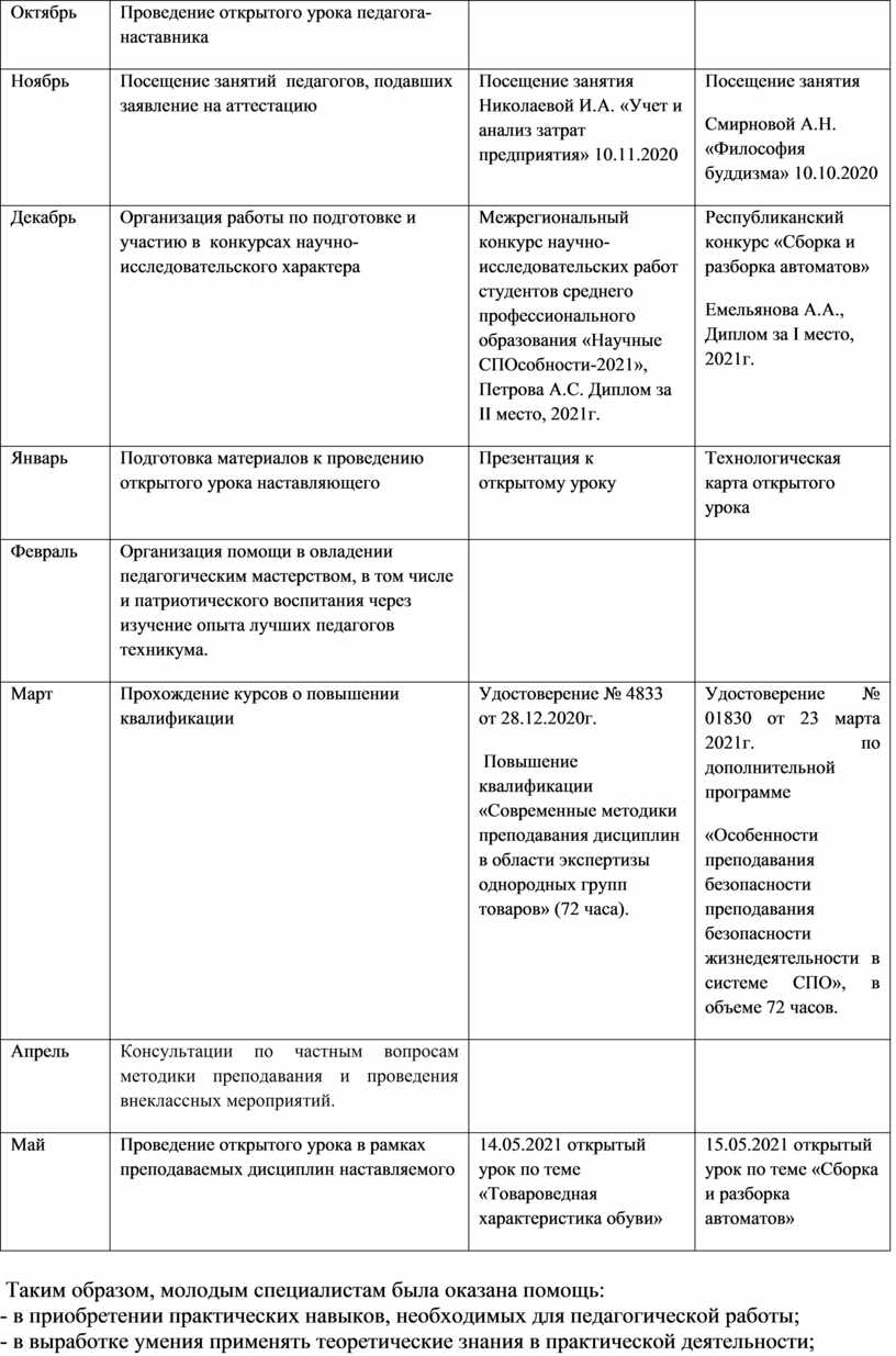 В соответствии с приказом техникума № 203 от 15.09.2020 года в рамках программы наставничества был разработан план и проведена работа: