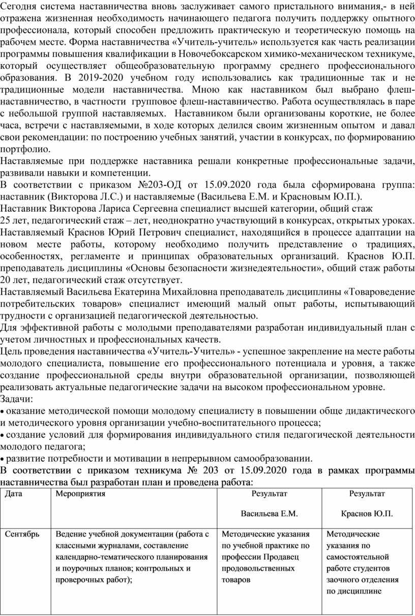 В соответствии с приказом №203-ОД от 15.09.2020 года была сформирована группа: наставник (Викторова Л.С.) и наставляемые (Васильева Е.М. и Красновым Ю.П.).