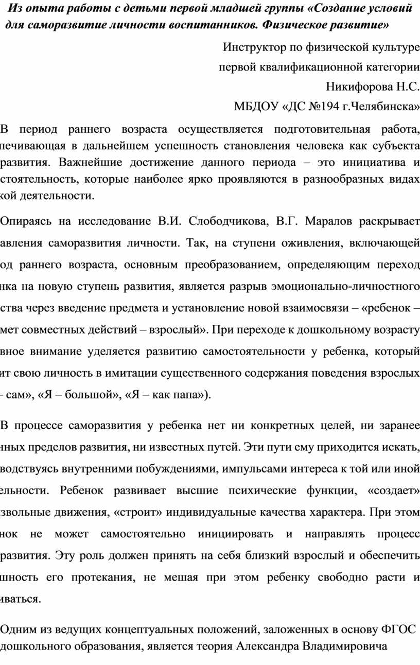 Из опыта работы с детьми первой младшей группы «Создание условий для саморазвитие личности воспитанников. Физическое развитие»