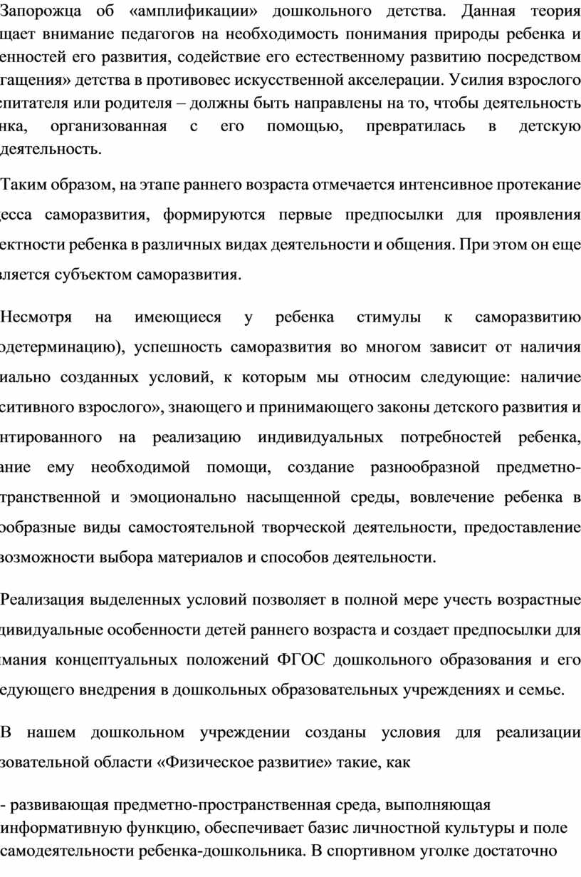 Одним из ведущих концептуальных положений, заложенных в основу ФГОС дошкольного образования, является теория Александра Владимировича Запорожца об «амплификации» дошкольного детства. Данная теория обращает внимание педагогов на необходимость понимания природы ребенка и особенностей его развития, содействие его естественному развитию посредством «обогащения» детства в противовес искусственной акселерации. Усилия взрослого – воспитателя или родителя – должны быть направлены на то, чтобы деятельность ребенка, организованная с его помощью, превратилась в детскую самодеятельность.