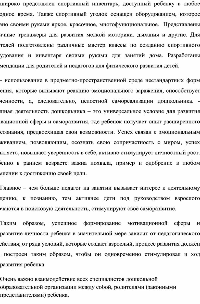 - использование в предметно-пространственной среде нестандартных форм обучения, которые вызывают реакцию эмоционального заражения, способствует увлеченности, а, следовательно, целостной самореализации дошкольника. - успешная деятельность дошкольника – это универсальное условие для развития мотивационной сферы и саморазвития, где ребенок получает опыт расширенного самосознания, предвосхищая свои возможности. Успех связан с эмоциональным переживанием, позволяющим, осознать свою сопричастность с миром, успех «окрыляет», повышает уверенность в себе, активно стимулирует личностный рост. Особенно в раннем возрасте важна похвала, пример и одобрение в любом стремлении к достижению своей цели.