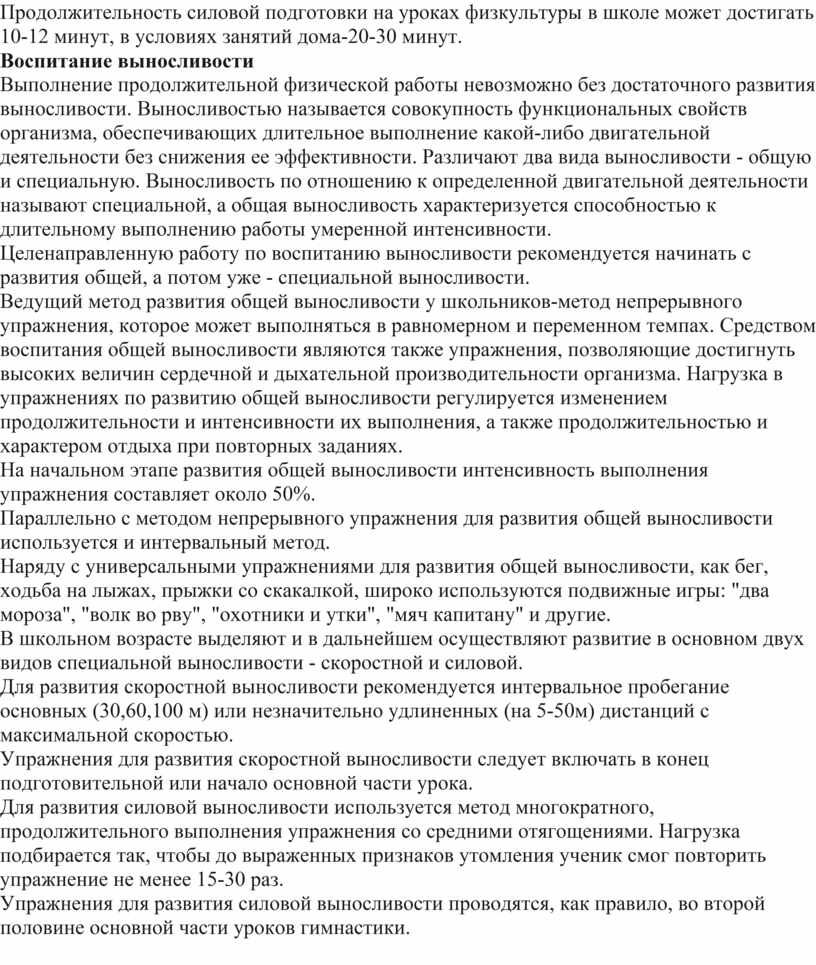 Продолжительность силовой подготовки на уроках физкультуры в школе может достигать 10-12 минут, в условиях занятий дома-20-30 минут.