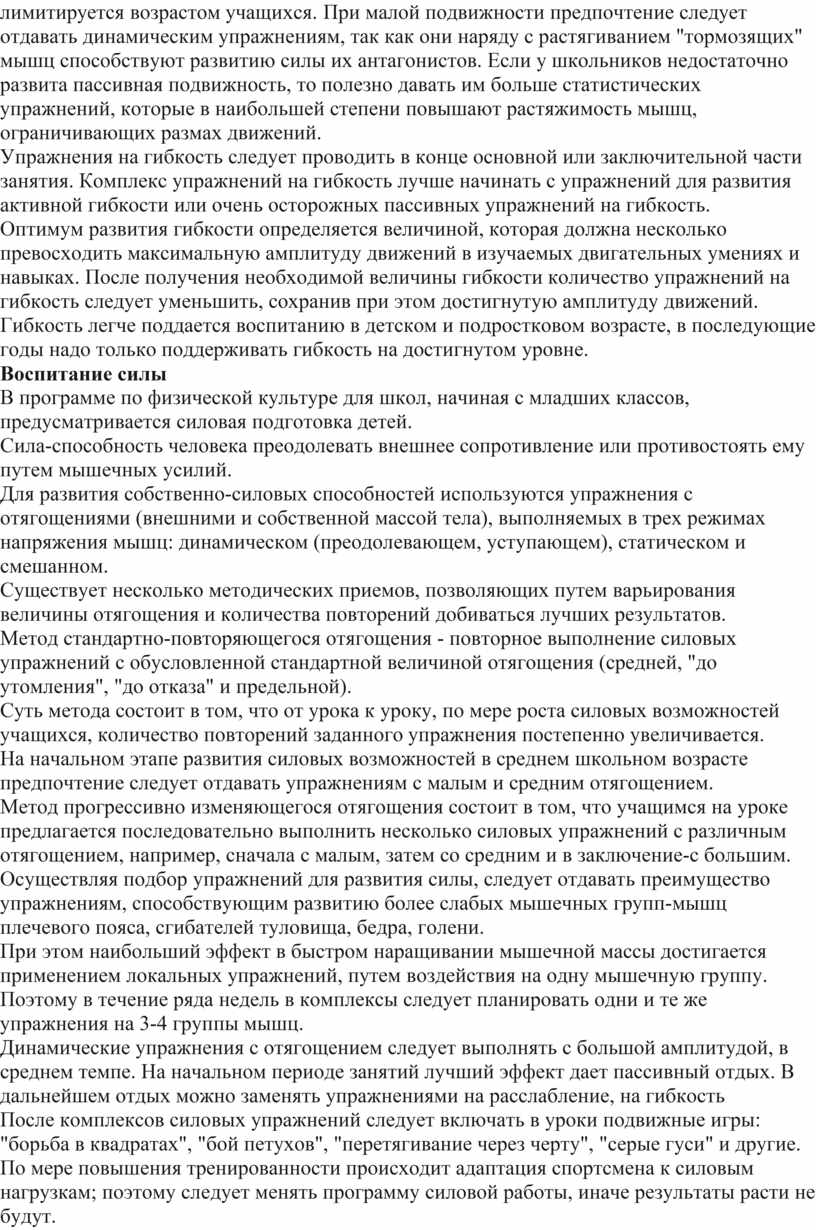 Нагрузка в упражнениях на гибкость определяется числом повторений, необходимым для достижения в данном занятии предельной амплитуды движений. Количество повторений лимитируется возрастом учащихся. При малой подвижности предпочтение следует отдавать динамическим упражнениям, так как они наряду с растягиванием "тормозящих" мышц способствуют развитию силы их антагонистов. Если у школьников недостаточно развита пассивная подвижность, то полезно давать им больше статистических упражнений, которые в наибольшей степени повышают растяжимость мышц, ограничивающих размах движений.