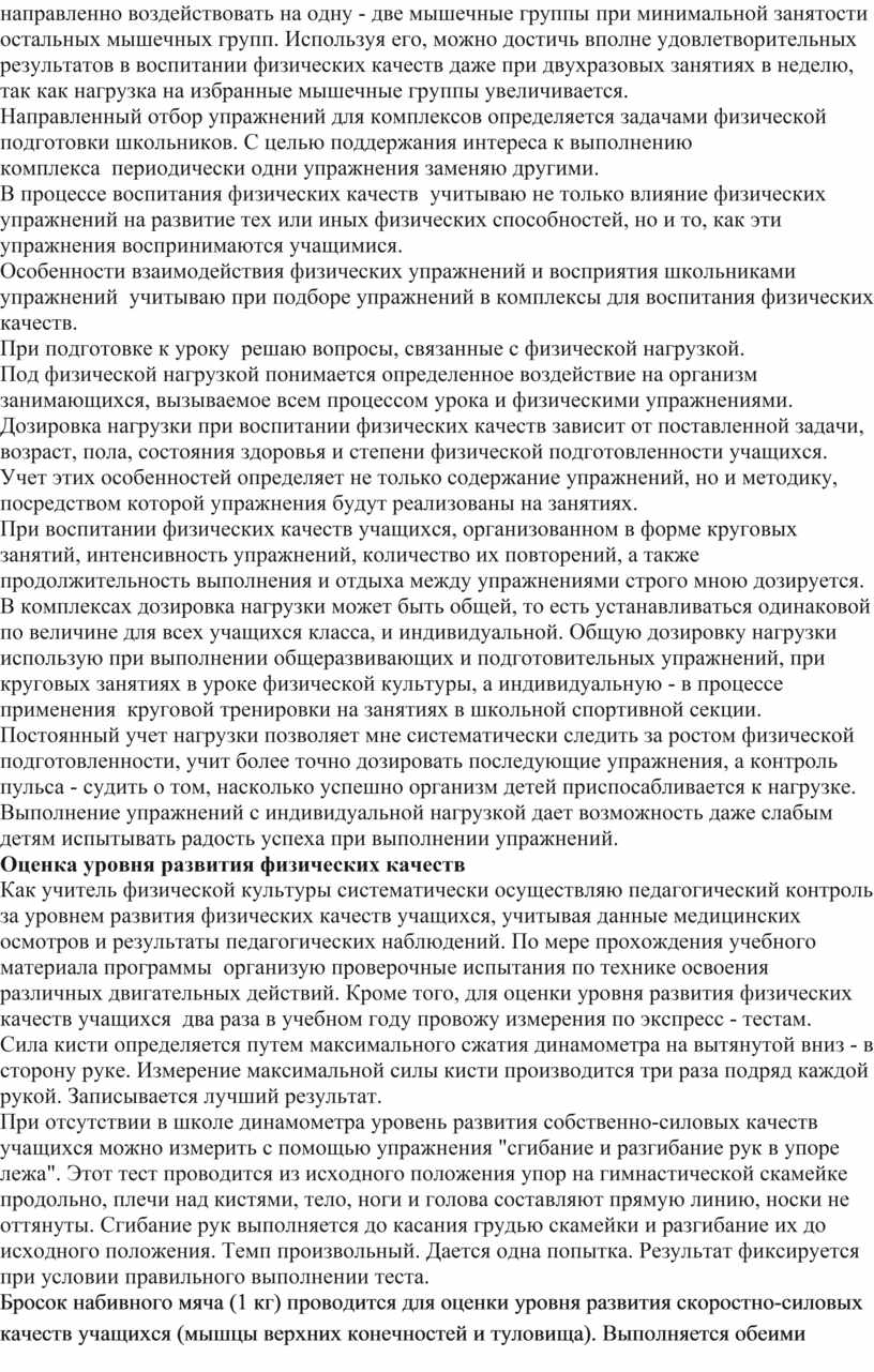 Как учитель физической культуры систематически осуществляю педагогический контроль за уровнем развития физических качеств учащихся, учитывая данные медицинских осмотров и результаты педагогических наблюдений. По мере прохождения учебного материала программы организую проверочные испытания по технике освоения различных двигательных действий. Кроме того, для оценки уровня развития физических качеств учащихся два раза в учебном году провожу измерения по экспресс - тестам.