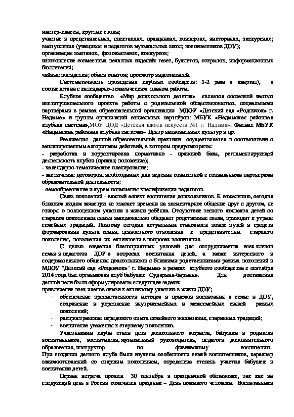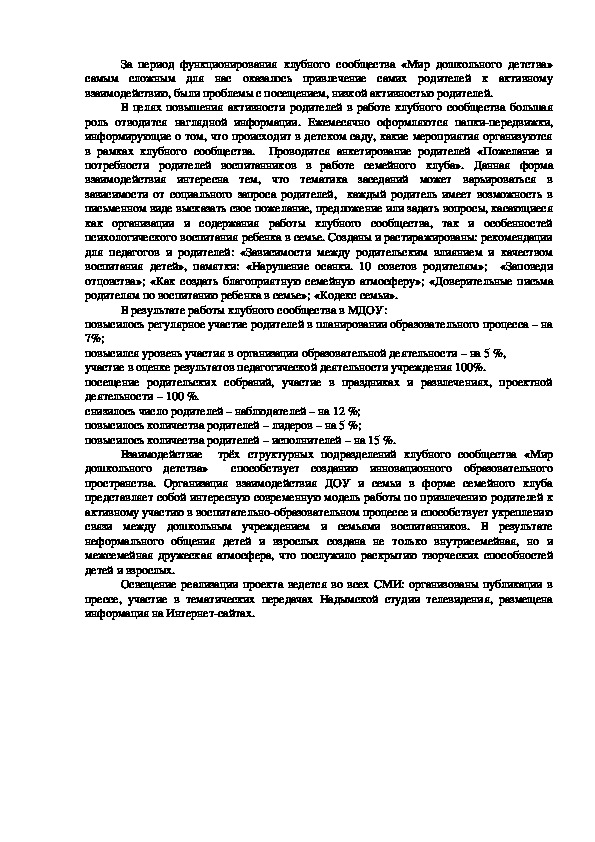 Проанализировав сложившуюся ситуацию, существующие в практике формы и методы взаимодействия ДОУ с родителями мы пришли к выводу, что наиболее эффективной формой сотрудничества с родителями является организация клубного сообщества «Мир дошкольного детства» в пространстве родитель - ребёнок - детский сад - социальные партнёры. Данная форма работы на протяжении более 5 лет (с сентября 2012 года) успешно развивается администрацией и педагогическим коллективом МДОУ «Детский сад «Родничок» г. Надыма» .