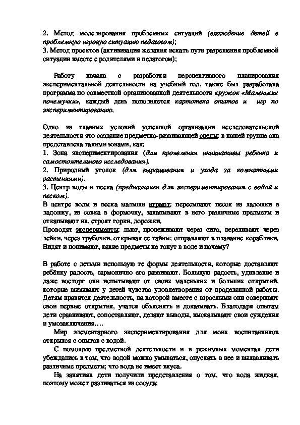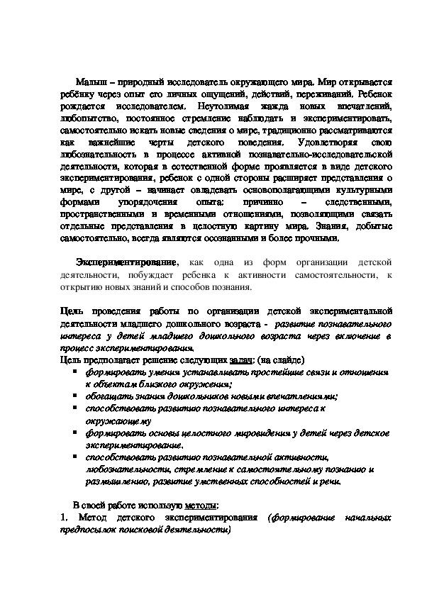 представлен материал из опыта работы "Развитие познавательной активности у младших дошкольников через элементарное экспериментирование". Положительным результатом работы в данном направлении могут служить данные мониторинга, проведенного в начале и середине года. Можно сделать вывод, о том, что организованная исследовательская деятельность позволяет педагогу сделать процесс обучения эффективным и более полно удовлетворяющим естественную любознательность дошкольников, развивая их познавательную активность.