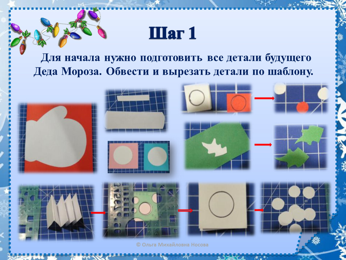 Для начала нужно подготовить все детали будущего Деда Мороза. Обвести и вырезать детали по шаблону.