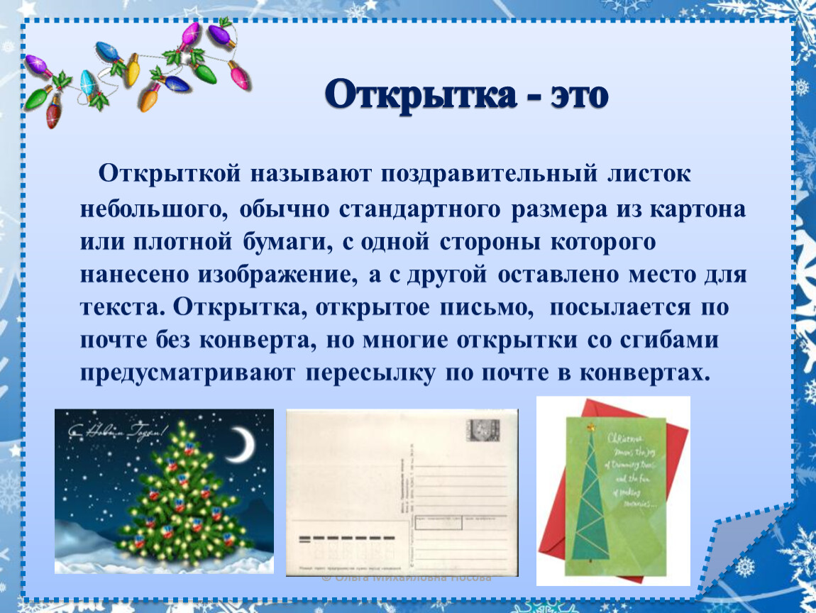 Открыткой называют поздравительный листок небольшого, обычно стандартного размера из картона или плотной бумаги, с одной стороны которого нанесено изображение, а с другой оставлено место для текста. Открытка, открытое письмо, посылается по почте без конверта, но многие открытки со сгибами предусматривают пересылку по почте в конвертах.
