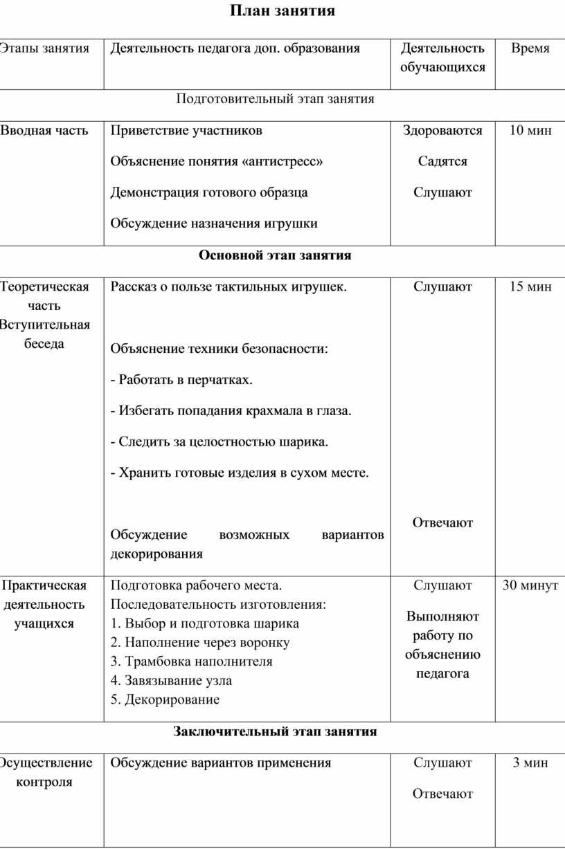 Приветствие участников Объяснение понятия «антистресс» Демонстрация готового образца Обсуждение назначения игрушки |