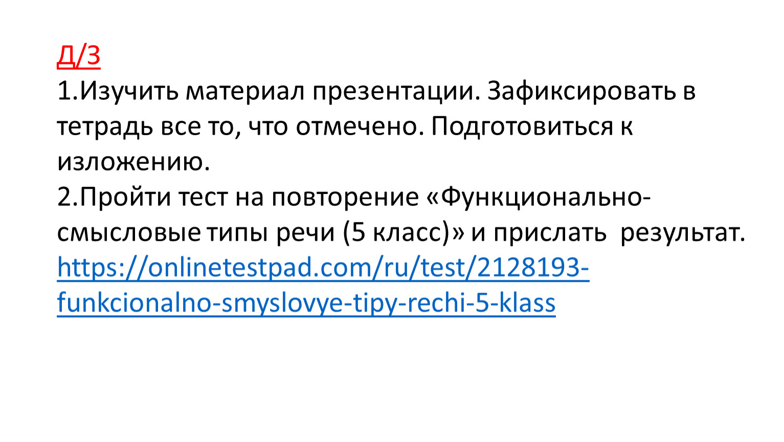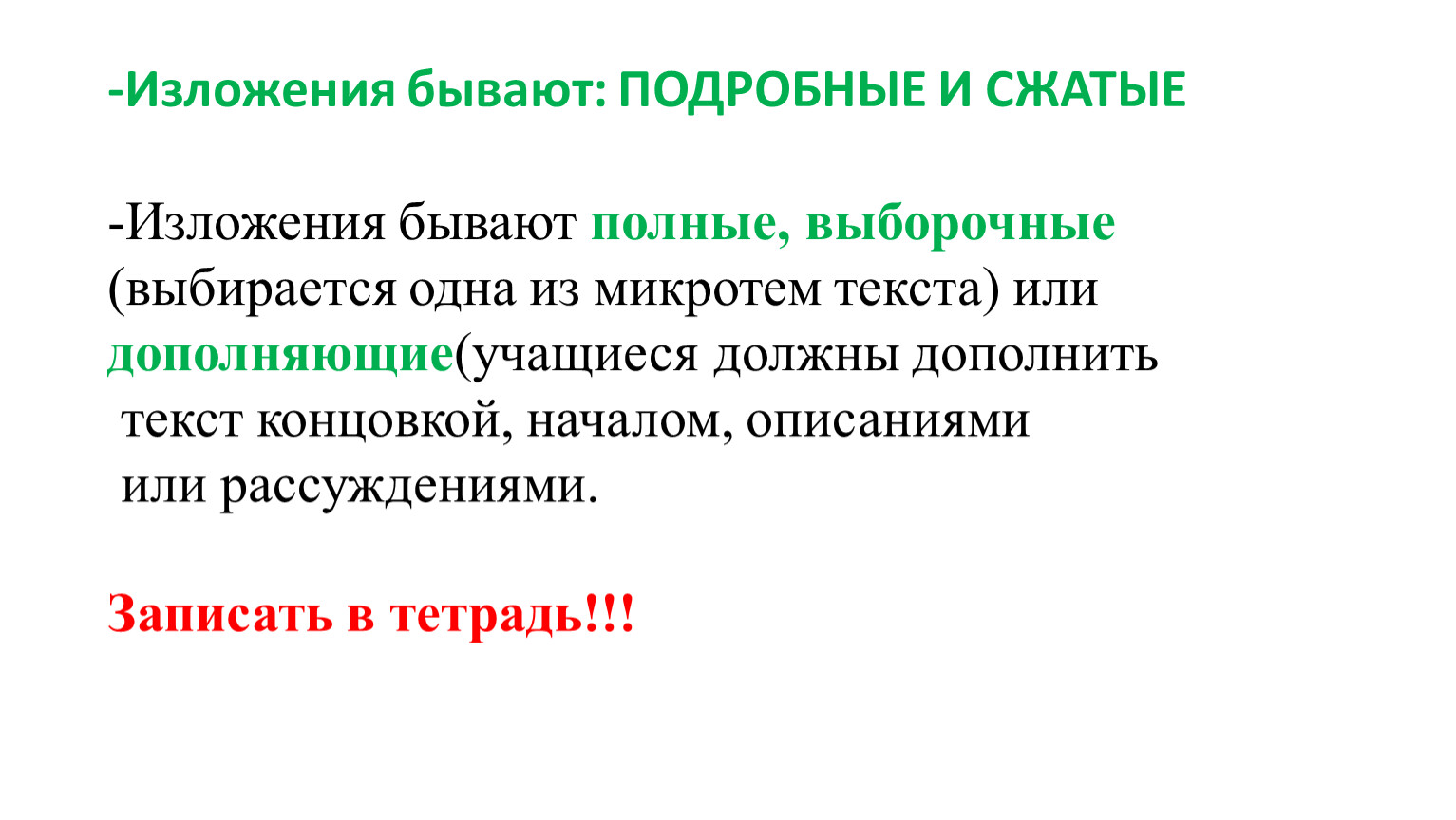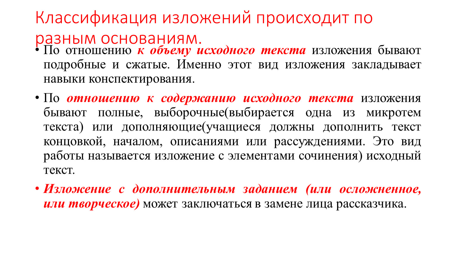 По отношению к содержанию исходного текста изложения бывают полные, выборочные(выбирается одна из микротем текста) или дополняющие(учащиеся должны дополнить текст концовкой, началом, описаниями или рассуждениями. Это вид работы называется изложение с элементами сочинения) исходный текст.