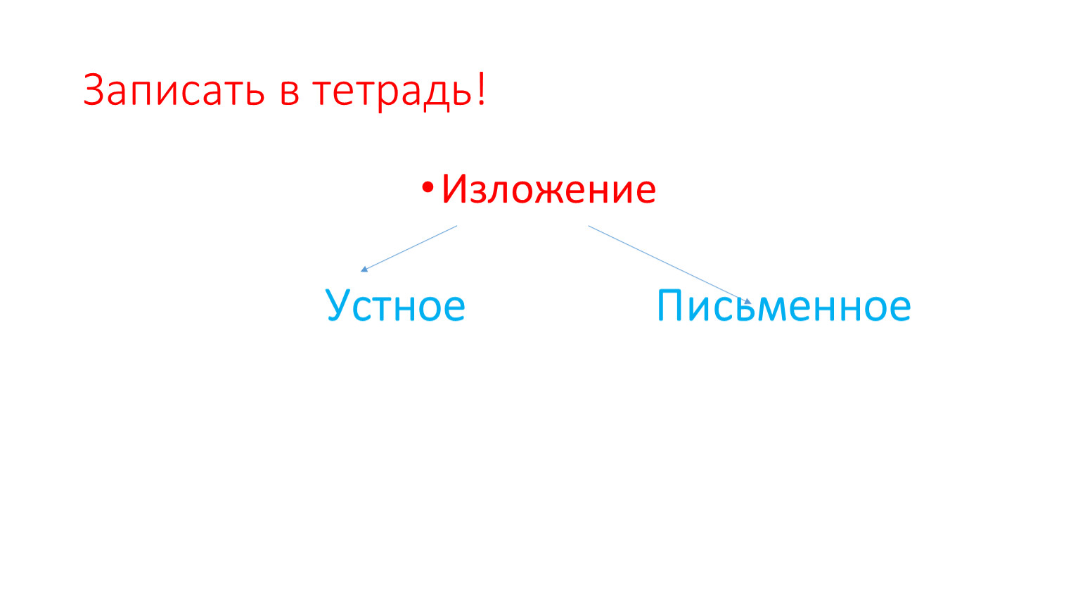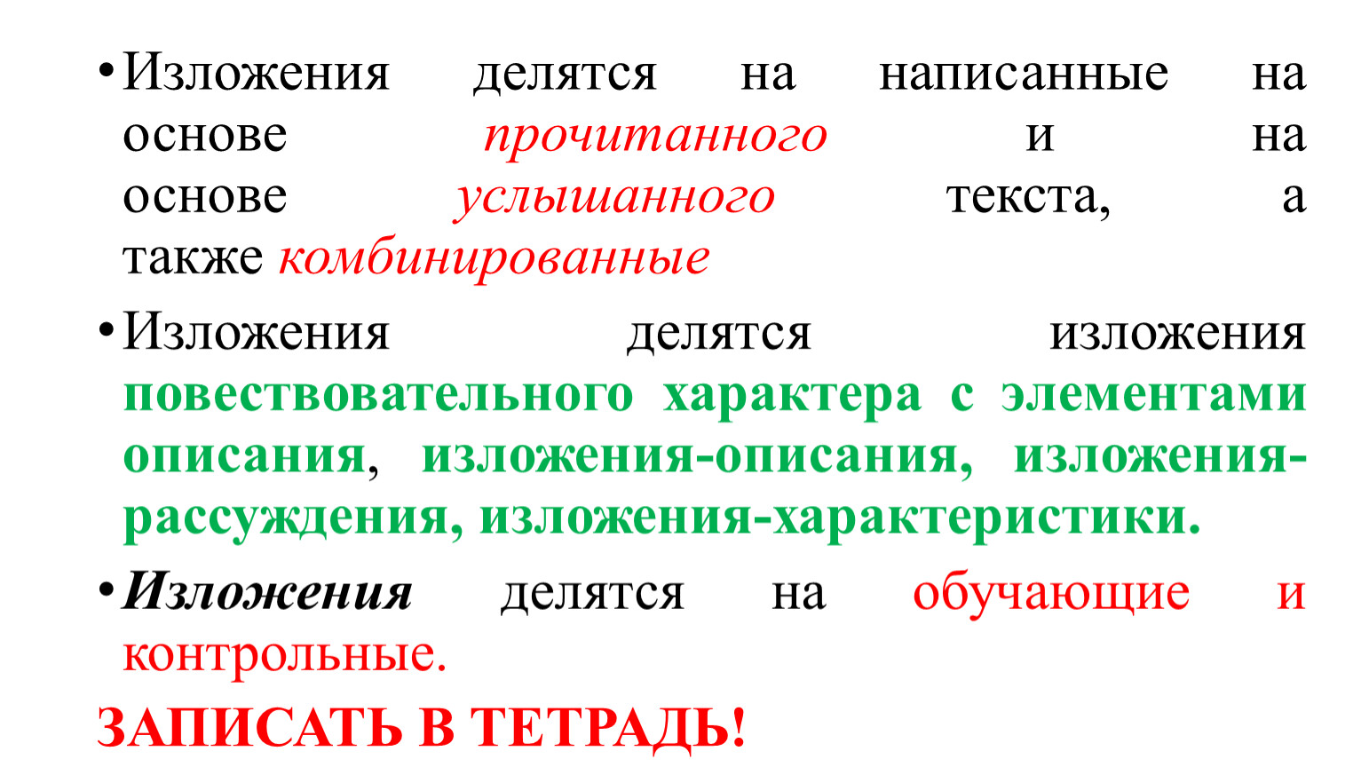 Изложения делятся на написанные на основе прочитанного и на основе услышанного текста, а также комбинированные