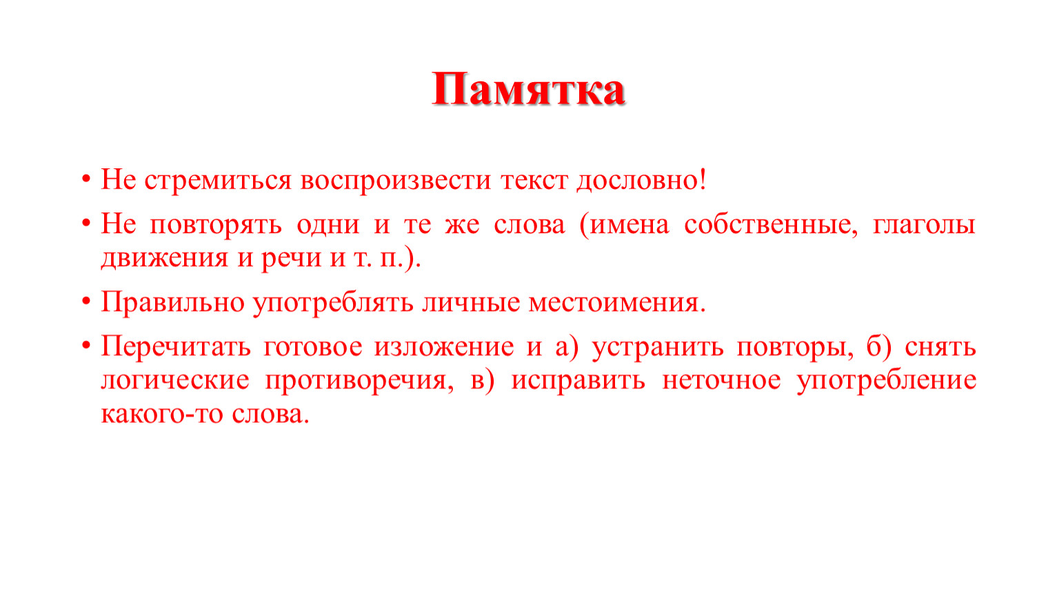 Не повторять одни и те же слова (имена собственные, глаголы движения и речи и т. п.).