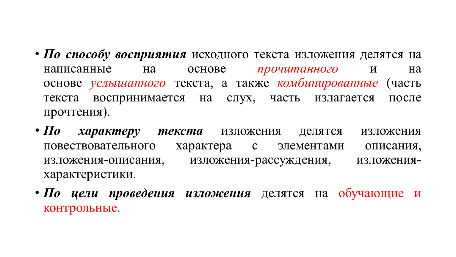 По способу восприятия исходного текста изложения делятся на написанные на основе прочитанного и на основе услышанного текста, а также комбинированные (часть текста воспринимается на слух, часть излагается после прочтения).