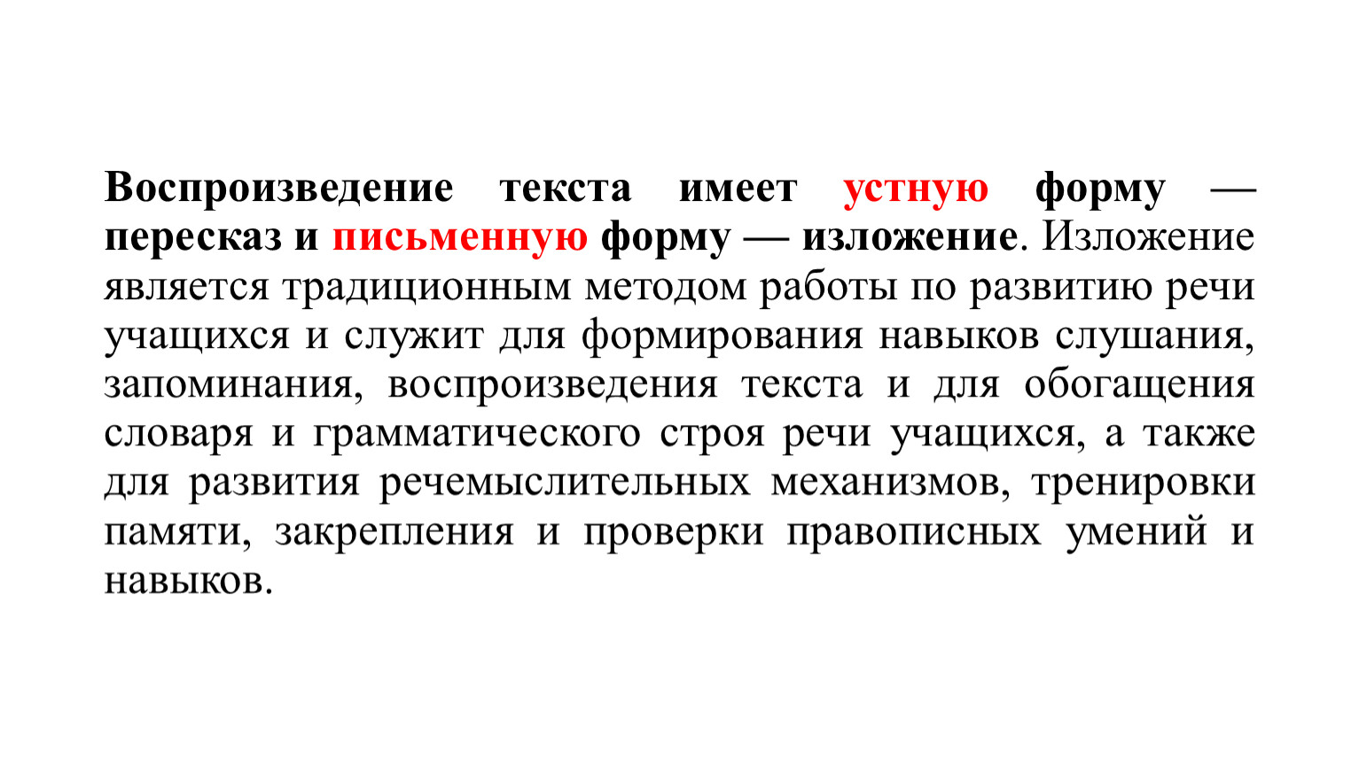 Воспроизведение текста имеет устную форму — пересказ и письменную форму — изложение. Изложение является традиционным методом работы по развитию речи учащихся и служит для формирования навыков слушания, запоминания, воспроизведения текста и для обогащения словаря и грамматического строя речи учащихся, а также для развития речемыслительных механизмов, тренировки памяти, закрепления и проверки правописных умений и навыков.