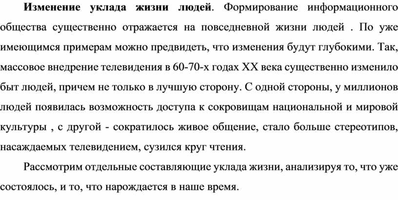 Изменение уклада жизни людей. Формирование информационного общества существенно отражается на повседневной жизни людей . По уже имеющимся примерам можно предвидеть, что изменения будут глубокими. Так, массовое внедрение телевидения в 60-70-х годах ХХ века существенно изменило быт людей, причем не только в лучшую сторону. С одной стороны, у миллионов людей появилась возможность доступа к сокровищам национальной и мировой культуры , с другой - сократилось живое общение, стало больше стереотипов, насаждаемых телевидением, сузился круг чтения.