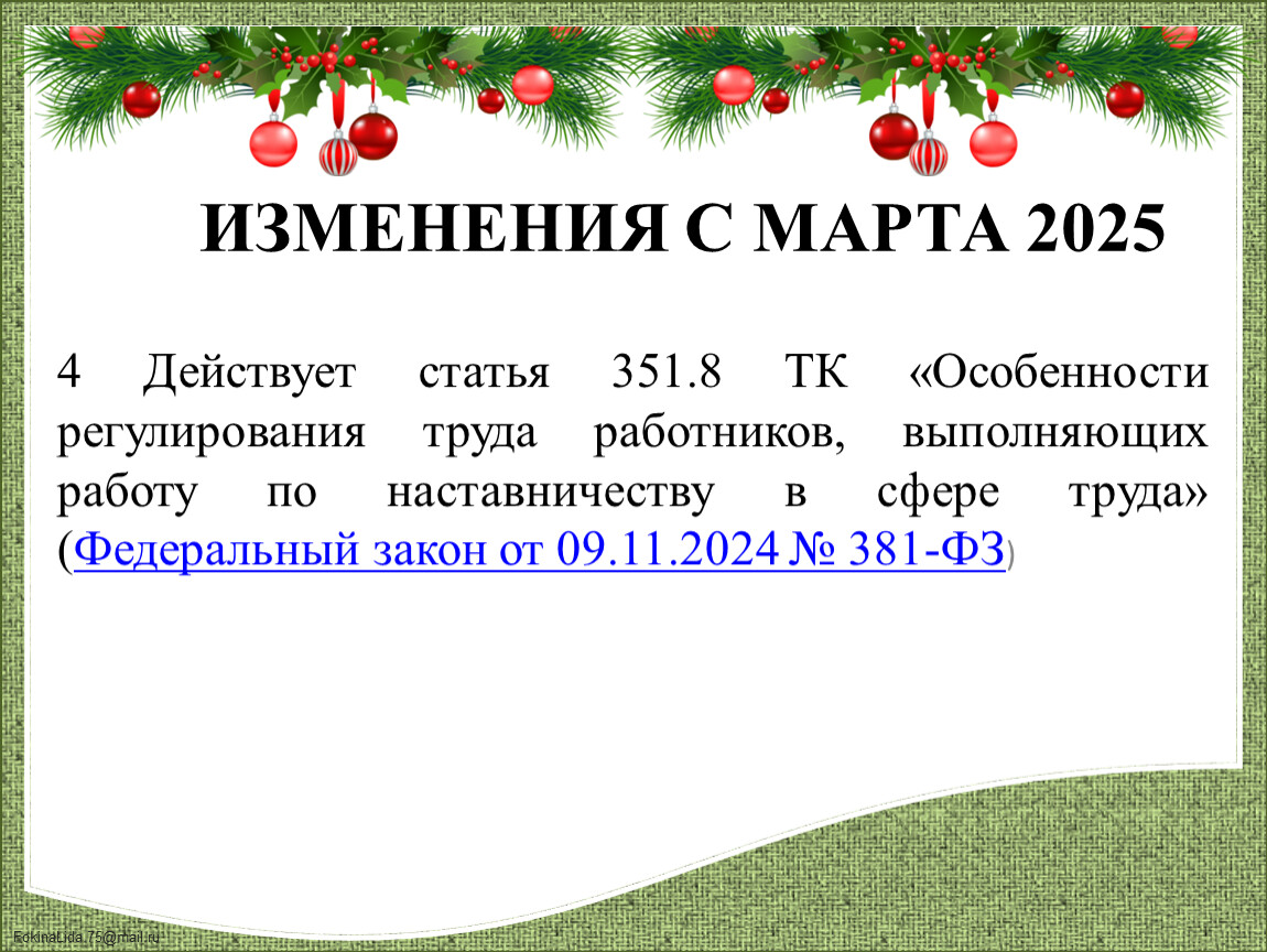 4 Действует статья 351.8 ТК «Особенности регулирования труда работников, выполняющих работу по наставничеству в сфере труда» (Федеральный закон от 09.11.2024 № 381-ФЗ)