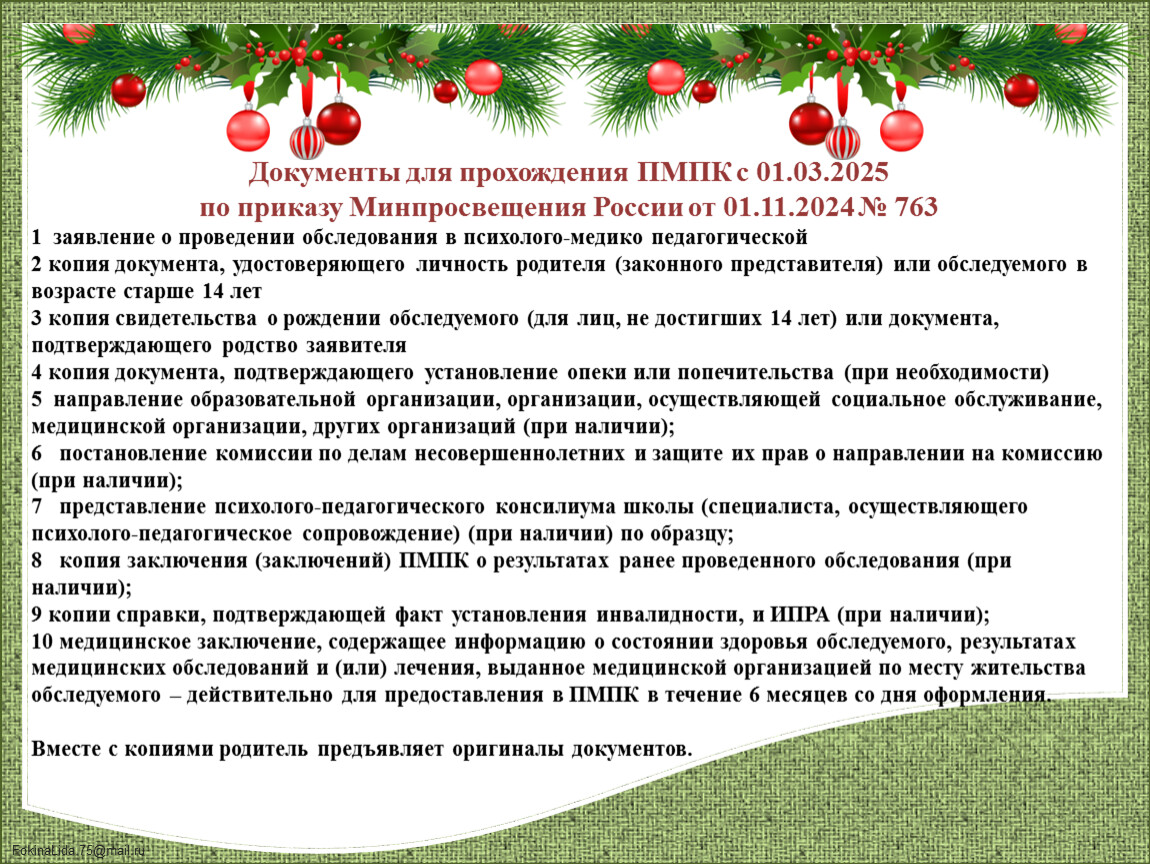1 заявление о проведении обследования в психолого-медико педагогической2 копия документа, удостоверяющего личность родителя (законного представителя) или обследуемого в возрасте старше 14 лет3 копия свидетельства о рождении обследуемого (для лиц, не достигших 14 лет) или документа, подтверждающего родство заявителя4 копия документа, подтверждающего установление опеки или попечительства (при необходимости)5 направление образовательной организации, организации, осуществляющей социальное обслуживание, медицинской организации, других организаций (при наличии);6 постановление комиссии по делам несовершеннолетних и защите их прав о направлении на комиссию (при наличии);7 представление психолого-педагогического консилиума школы (специалиста, осуществляющего психолого-педагогическое сопровождение) (при наличии) по образцу;8 копия заключения (заключений) ПМПК о результатах ранее проведенного обследования (при наличии);9 копии справки, подтверждающей факт установления инвалидности, и ИПРА (при наличии);10 медицинское заключение, содержащее информацию о состоянии здоровья обследуемого, результатах медицинских обследований и (или) лечения, выданное медицинской организацией по месту жительства обследуемого – действительно для предоставления в ПМПК в течение 6 месяцев со дня оформления.Вместе с копиями родитель предъявляет оригиналы документов.