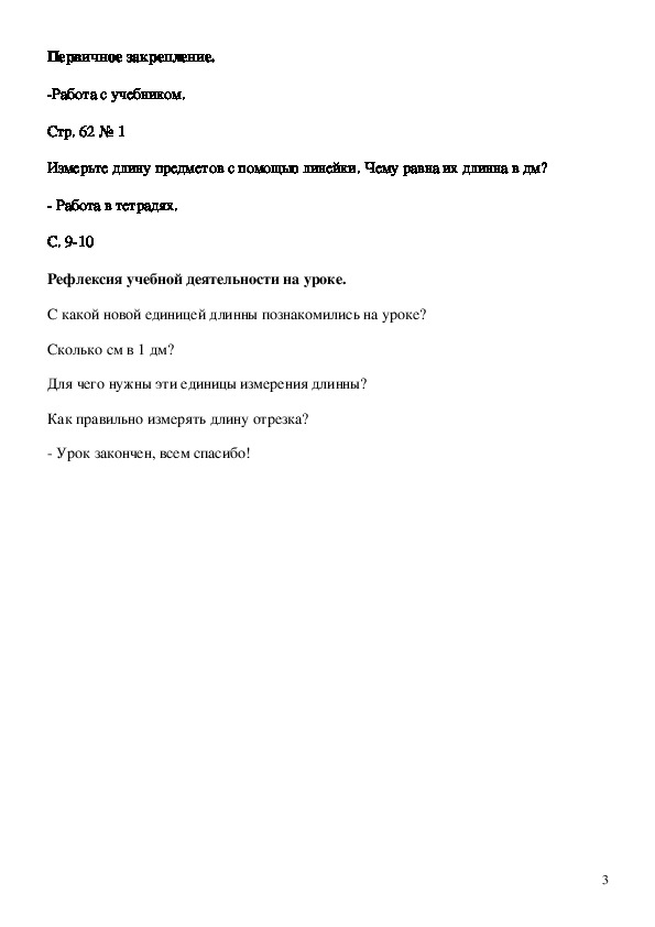 Цели урока: Создать условия умений измерять длины предметов в дециметрах.