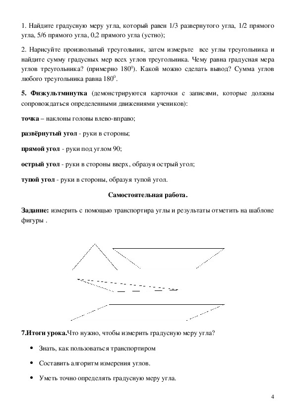 Задание: измерить с помощью транспортира углы и результаты отметить на шаблоне