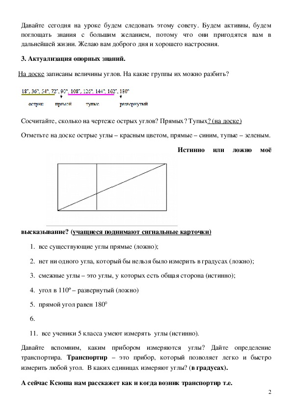1.Актуализироват знания учащихся по теме «Транспортир» через устные и письменные задания